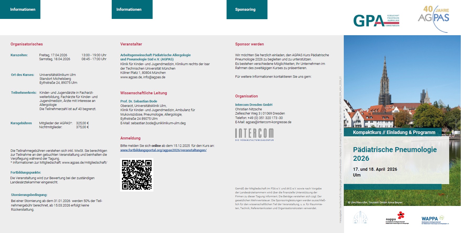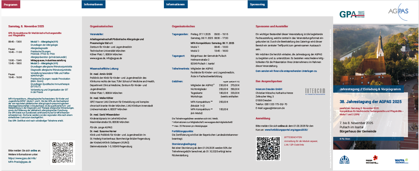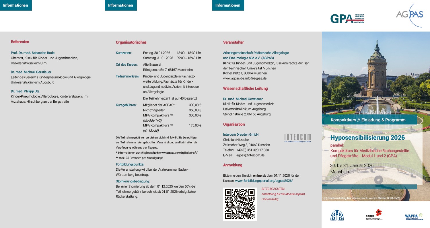 die Arbeitsgemeinschaft Pädiatrische Allergologie und Pneumologie Süd e.V. (AGPAS) führt auch 2026 wieder zahlreiche Fortbildungsveranstaltungen durch, zu denen wir Sie herzlich einladen möchten.